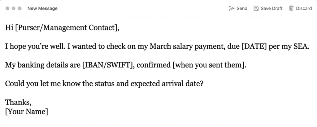 Industry context: Late salary payments happen to yacht and commercial crew for many reasons – management changes, vessel relocations, accounting delays, or simple errors. Knowing the right first steps keeps the situation manageable and protects your position if the delay continues.